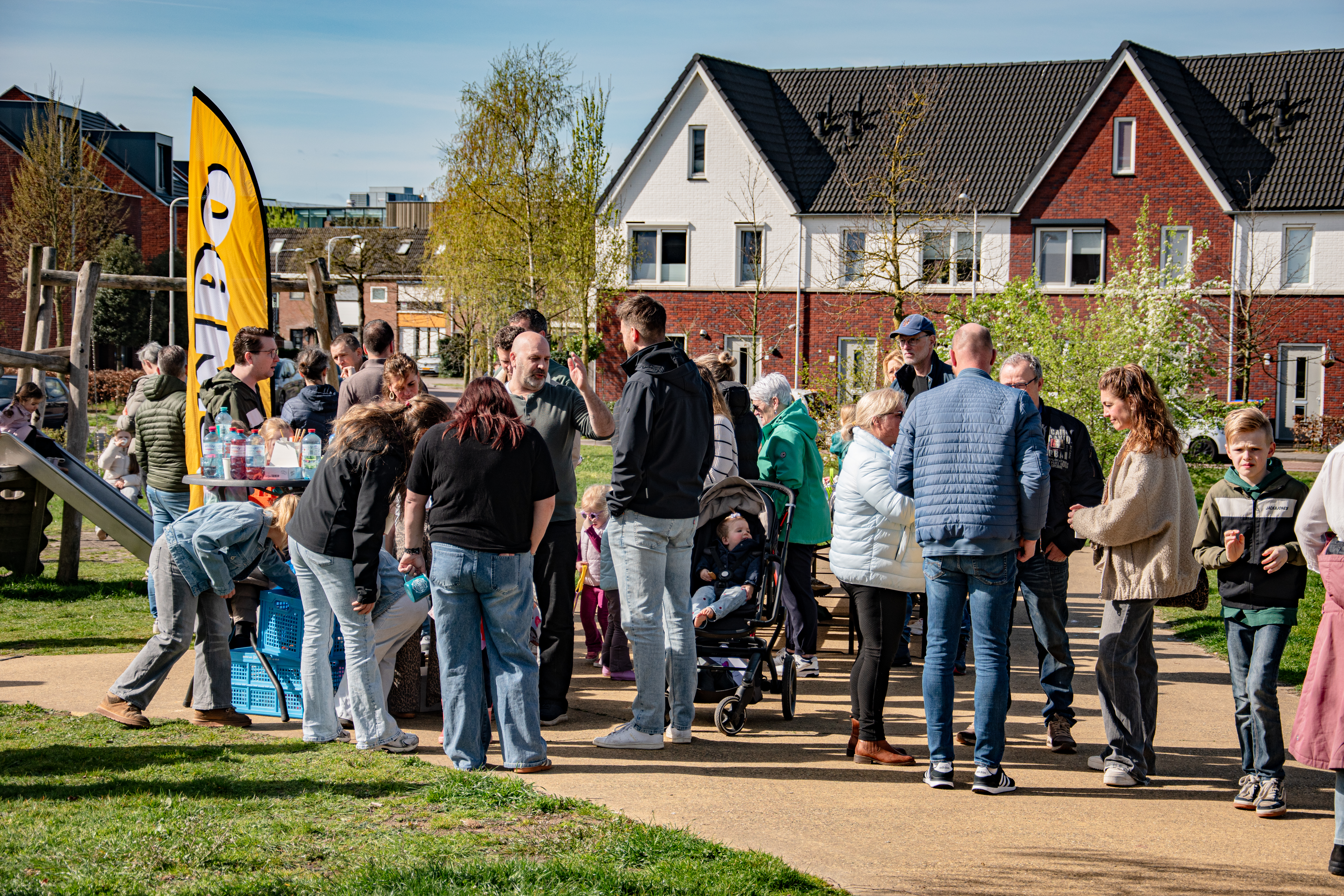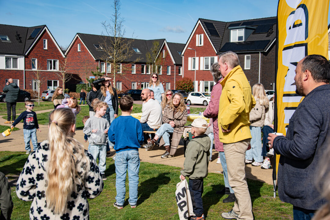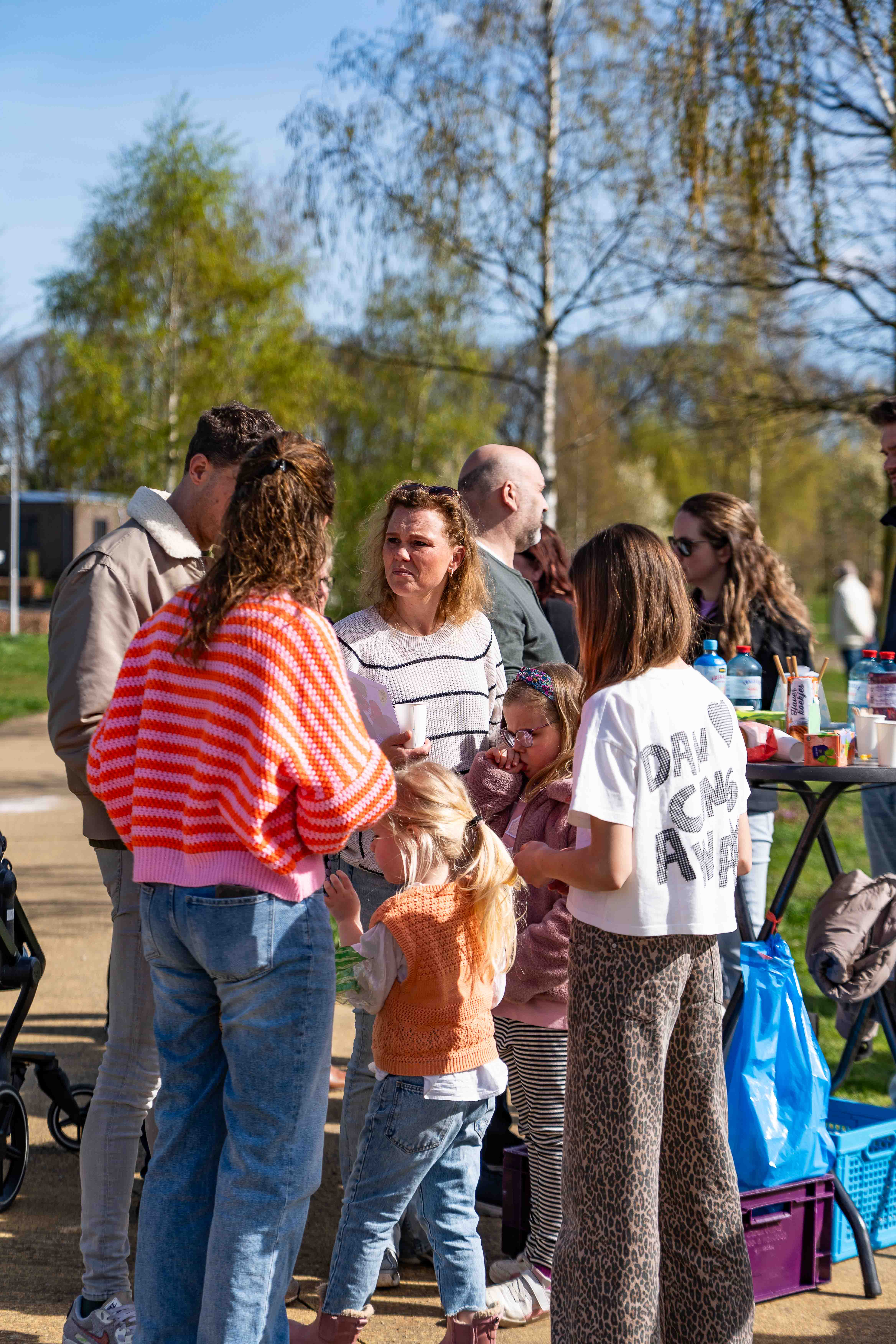 Na een kort dankwoord aan alle betrokkenen en sponsoren, gingen ongeveer 55 kinderen samen met hun ouders op zoek naar de verstopte plastic eieren in het park. Er werd fanatiek gezocht en volop genoten.
